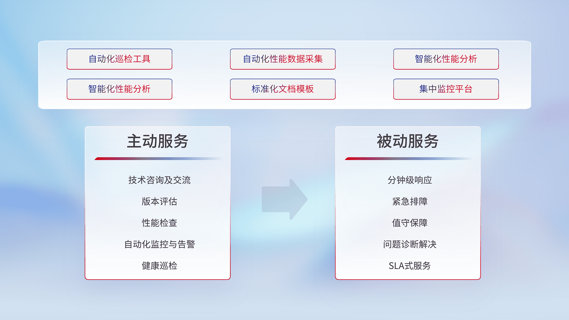 智能化工具和标准化文档,,,保障服务质量,,,提供主动服务(包含技术咨询、、版本评估、、、性能检查、、、自动化监控与告警、、、、健康巡检)和被动服务包含(分钟级响应、、、紧急排障、、、、值守保障、、、、问题诊断解决、、、、SLA服务)。。。